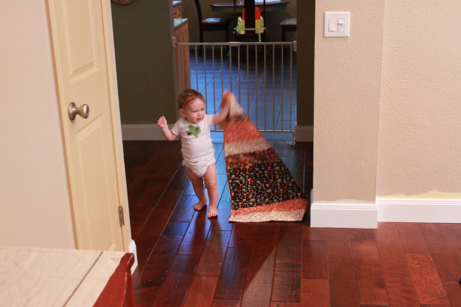 These pictures are kind of fuzzy. It was 7:30 am and I really was in no mood to mess with my camera, but William was using his new changing pad as a bull fighter's cape. So far, it's a new travel toy. He pulls it out of my purse and plays with ribbon. It makes me so happy that he loves something I made that WASN'T a muffin. Yay for learning to sew!